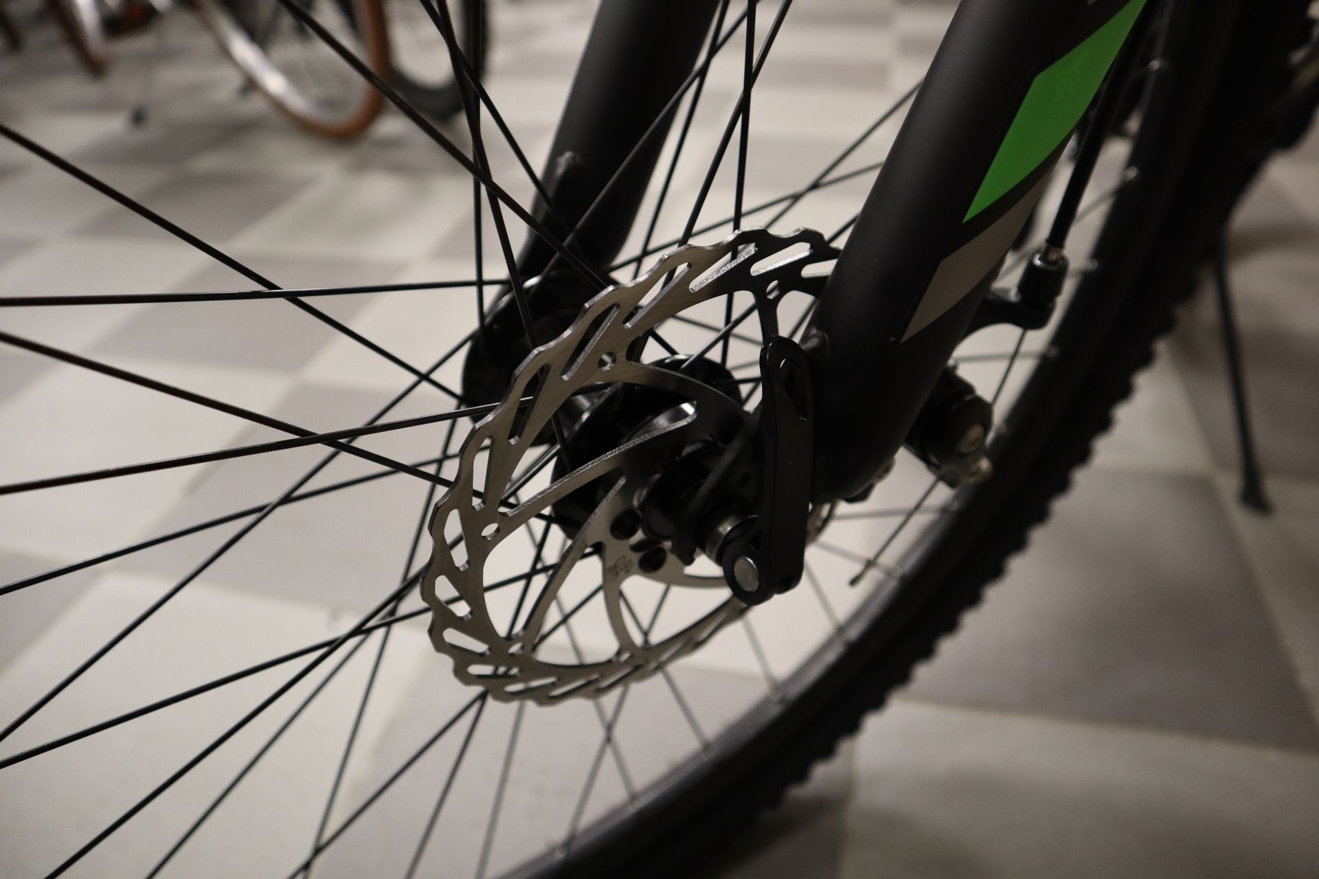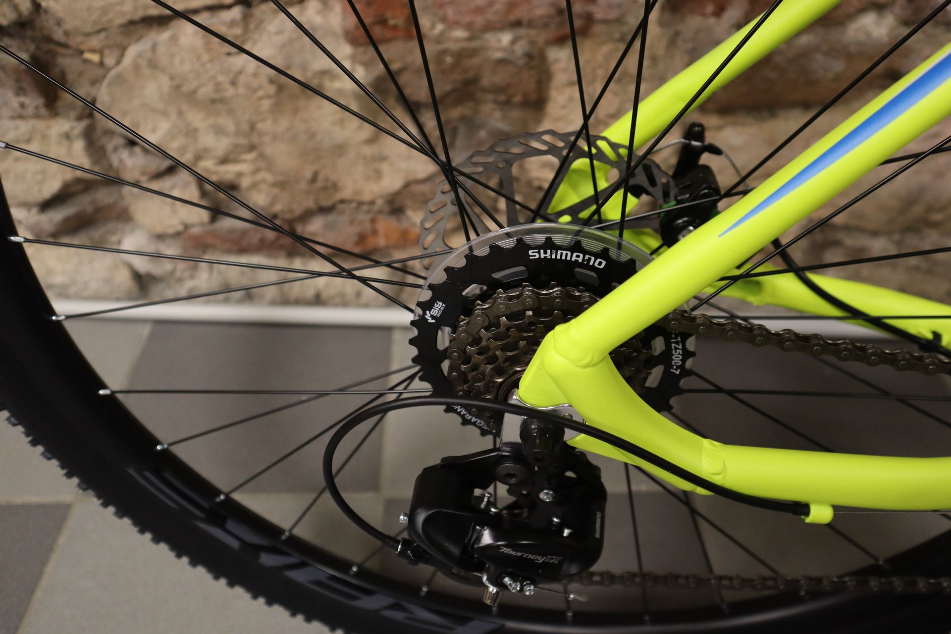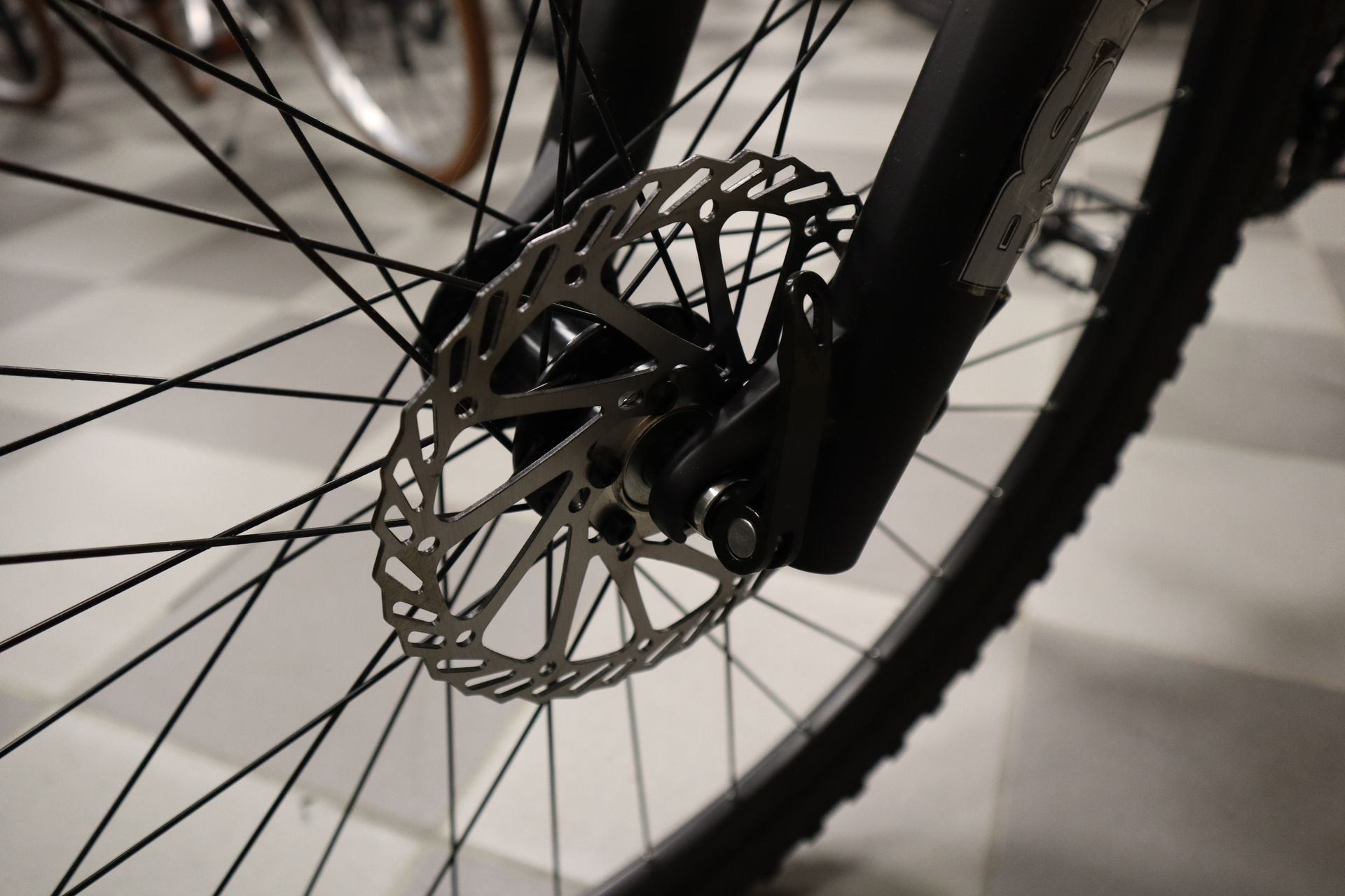 Telaio in alluminio, forcella ammortizzata regolabile bloccabile. Freni a disco meccanici, cambio Shimano Altus 24V. Cerchi a profilo alto e mozzi in alluminio.